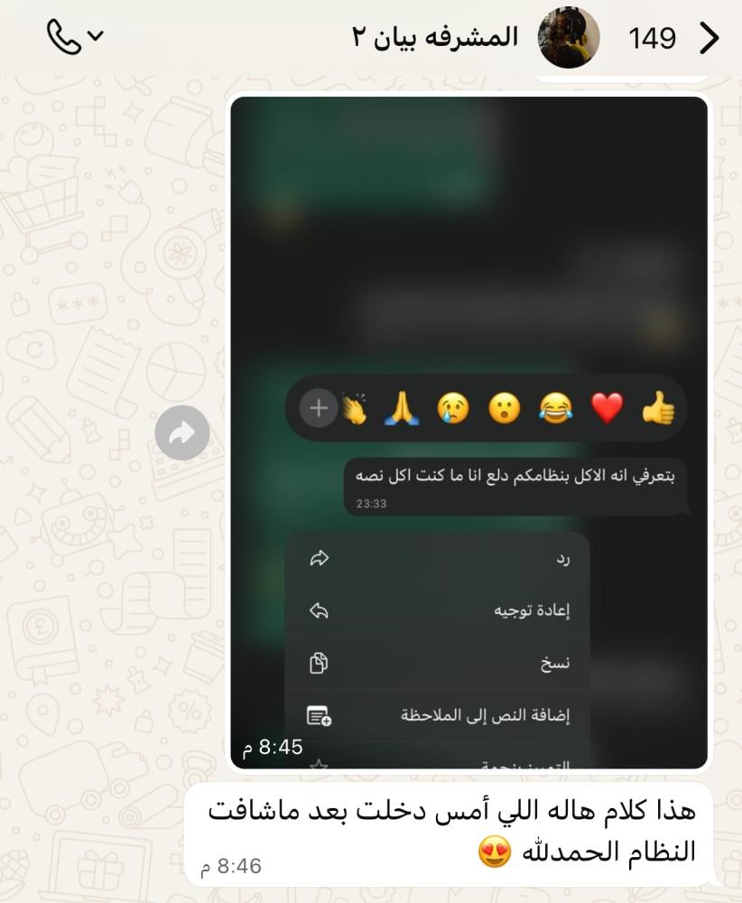البرنامج نظام حياة جدا مرتاحه عليه ومااحسه مقيدني بوجبات معينه بالعكس يوم فهمته وعرفت كيف استبدل بنفس الكميات صار مره سهل والكوتش مره بطله وتعطي وماتقصر ترد ع كل استفسار 🤍